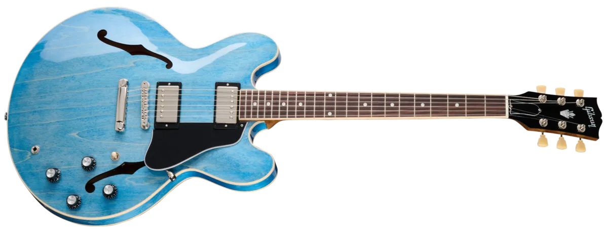 The ES-335 is a Gibson ES™ model that has been wowing guitar players all over the world for over six decades. From its introduction in 1958, the Gibson ES-335 set an it unmatched standard, and it remains one of the world's most beloved and versatile electric guitars today. Regardless of the styles of music you play, from rock to blues, from country to metal, the ES-335's versatility enables you to do them all. This ES-335 is no exception and is now available in exciting custom colors that are sure to get attention. The ES-335's body is crafted with layered maple/poplar/maple for the top, back, and sides. It is coupled with a solid maple centerblock to create the amazing sustain, warmth, and resonant tone that players crave in a semi-hollowbody instrument. The solid maple center block also helps in controlling the unwanted feedback that often plagues full hollowbody guitars. The mahogany neck has a Rounded C profile that is extremely comfortable and easy to play. It's not too large or too small, but "just right" for many players. It is capped with a rosewood fretboard with a 12" radius that makes it easy to play chords and bend strings without fretting out, and that is adorned with acrylic dot inlays, and equipped with 22 medium jumbo frets. A Graph Tech® nut and Vintage Deluxe tuners with Keystone buttons help maintain tuning stability, while the nickel-plated ABR-1 Tune-O-Matic™M bridge and aluminum Stop Bar tailpiece anchor the strings solidly at the other end to deliver the outstanding sustain that the ES-335 is famous for. Gibson's Calibrated T-Type humbucker™ pickups in the lead (bridge) and rhythm (neck) positions deliver a wide range of tones and further reinforce the ES-335's exceptional versatility. They are hand-wired to individual volume and tone controls with 500k potentiometers and Orange Drop® tone capacitors, along with a three-way pickup selector switch that lets you run either pickup individually or combine them at will in any ratio you desire since each is controlled by a separate volume knob. The control knobs are stylish black Top Hats with silver reflectors. A Gibson hardshell case is also included to keep the ES-335 safe and secure when you're on the way to your next gig.