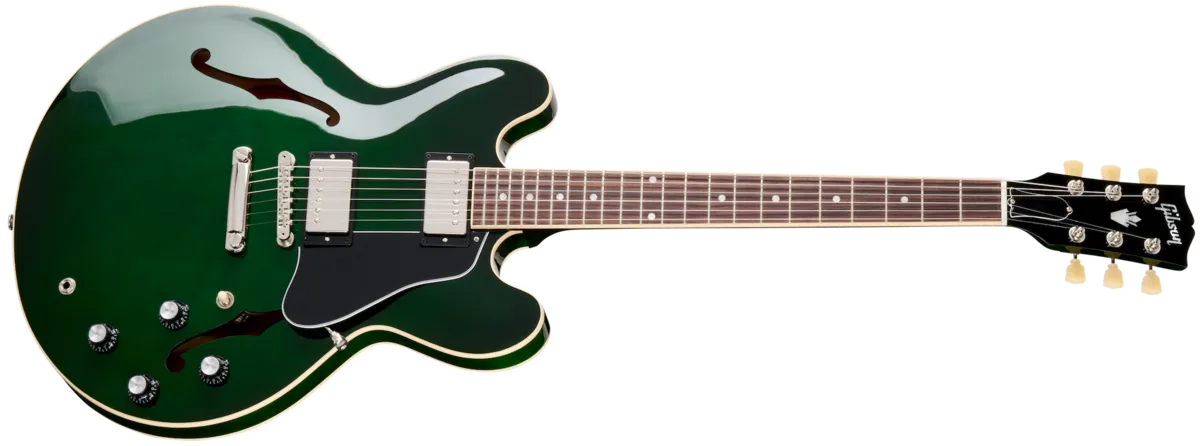 The ES-335 is a Gibson ES™ model that has been wowing guitar players all over the world for over six decades. From its introduction in 1958, the Gibson ES-335 set an it unmatched standard, and it remains one of the world's most beloved and versatile electric guitars today. Regardless of the styles of music you play, from rock to blues, from country to metal, the ES-335's versatility enables you to do them all. This ES-335 is no exception and is now available in exciting custom colors that are sure to get attention. The ES-335's body is crafted with layered maple/poplar/maple for the top, back, and sides. It is coupled with a solid maple centerblock to create the amazing sustain, warmth, and resonant tone that players crave in a semi-hollowbody instrument. The solid maple center block also helps in controlling the unwanted feedback that often plagues full hollowbody guitars. The mahogany neck has a Rounded C profile that is extremely comfortable and easy to play. It's not too large or too small, but "just right" for many players. It is capped with a rosewood fretboard with a 12" radius that makes it easy to play chords and bend strings without fretting out, and that is adorned with acrylic dot inlays, and equipped with 22 medium jumbo frets. A Graph Tech® nut and Vintage Deluxe tuners with Keystone buttons help maintain tuning stability, while the nickel-plated ABR-1 Tune-O-Matic™M bridge and aluminum Stop Bar tailpiece anchor the strings solidly at the other end to deliver the outstanding sustain that the ES-335 is famous for. Gibson's Calibrated T-Type humbucker™ pickups in the lead (bridge) and rhythm (neck) positions deliver a wide range of tones and further reinforce the ES-335's exceptional versatility. They are hand-wired to individual volume and tone controls with 500k potentiometers and Orange Drop® tone capacitors, along with a three-way pickup selector switch that lets you run either pickup individually or combine them at will in any ratio you desire since each is controlled by a separate volume knob. The control knobs are stylish black Top Hats with silver reflectors. A Gibson hardshell case is also included to keep the ES-335 safe and secure when you're on the way to your next gig.