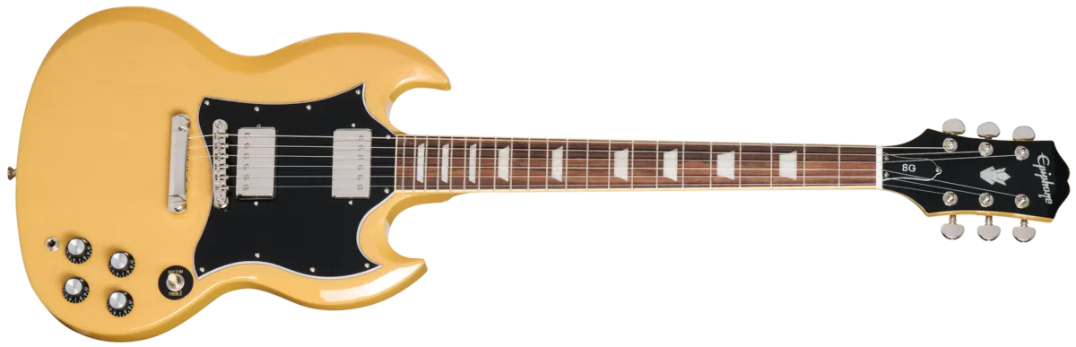 Part of the Inspired by Gibson Collection, the Epiphone SG Standard has been refreshed and is better than ever. The legendary SG™ a has long been a favorite of musicians across genres. From Sister Rosetta Tharpe, Eric Clapton, and George Harrison to Robbie Krieger, Angus Young, Tony lommi, and countless others, the SG has been played by many of the most beloved guitarists in history. The Epiphone SG Standard has a contoured, double-cutaway mahogany body that delivers unimpeded access to all 22 frets. The glued-in mahogany neck adds to the model's renowned sustain. The neck has a fast-playing Slim Taper™ C profile and is capped with a bound laurel fretboard that is equipped with 22 medium jumbo frets and is adorned with pearloid trapezoid inlays. The fretboard's 12" radius makes playing first-position chords easy while ensuring that string bends don't fret out when you play them. High-quality Grover® Rotomatic® tuning machines and a Graph Tech™M nut, paired with a fully adjustable Epiphone LockTone™M Tune-O-Matic™ bridge and Stop Bar tailpiece, work together to keep the tuning stability and intonation rock-solid. The Epiphone SG Standard is equipped with a pair of Epiphone's acclaimed ProBucker™ humbucking pickups that deliver all of the vintage-approved SG tones you could ask for. A ProBucker™ 2 humbucker™ is in the neck position, and a slightly hotter ProBucker 3 is installed in the bridge position. Each of the pickups is wired to its own individual volume and tone controls, along with a three-way toggle pickup selector switch, which lets you use either pickup alone or combine them in whatever ratio suits your mood and muse. Now available in an expanded selection of eye-catching colors, the Epiphone SG Standard is sure to turn heads and will impress players and fans alike. It comes complete with a premium gig bag to help keep it safe when traveling.