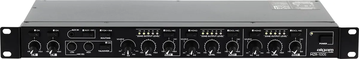 The MZR-1005 is an audio mixer/zoner designed to provide flexible, efficient sound management in public spaces such as bars, restaurants and shopping centers. With its 4 stereo RCA inputs and two microphone inputs with 2-band equalization and configurable talkover, you can mix a multitude of audio sources, from CD players to mixing consoles or smartphones. The MZR-1005 also features a 3.5 mm auxiliary input on the front panel, routing the signal to channel 1 by pressing the AUX>IN1 button.
